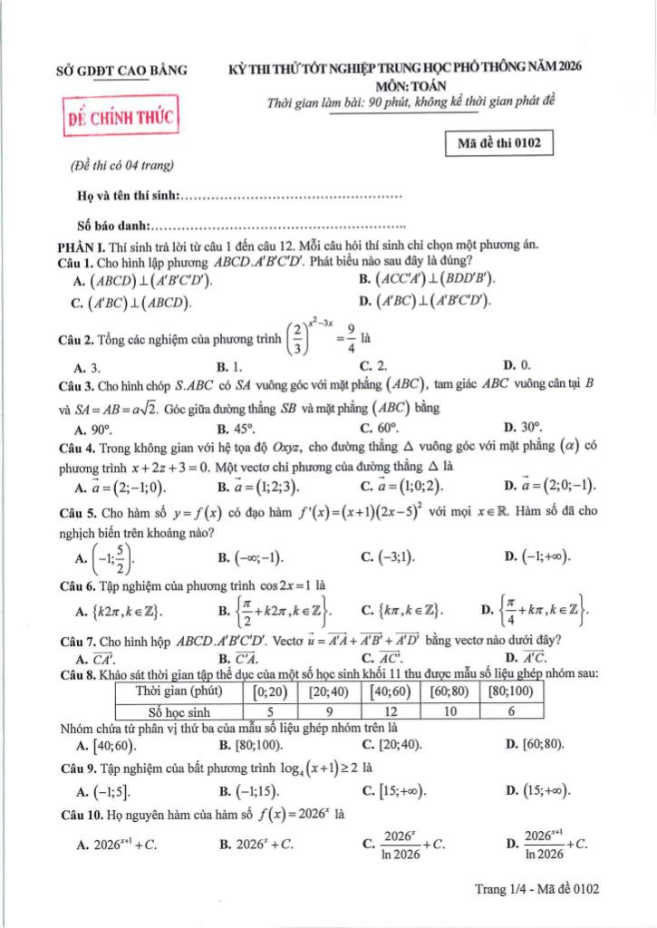 giaitoan.edu.vn giới thiệu đến quý thầy, cô giáo và các em học sinh đề thi thử tốt nghiệp Trung học Phổ thông năm 2026 môn Toán sở Giáo dục và Đào tạo tỉnh Cao Bằng. Kỳ thi được diễn ra vào ngày 04 tháng 04 năm 2026. Đề thi có đáp án mã đề 0101 – 0102 – 0103 – 0104 – 0105 – 0106 – 0107 – 0108.