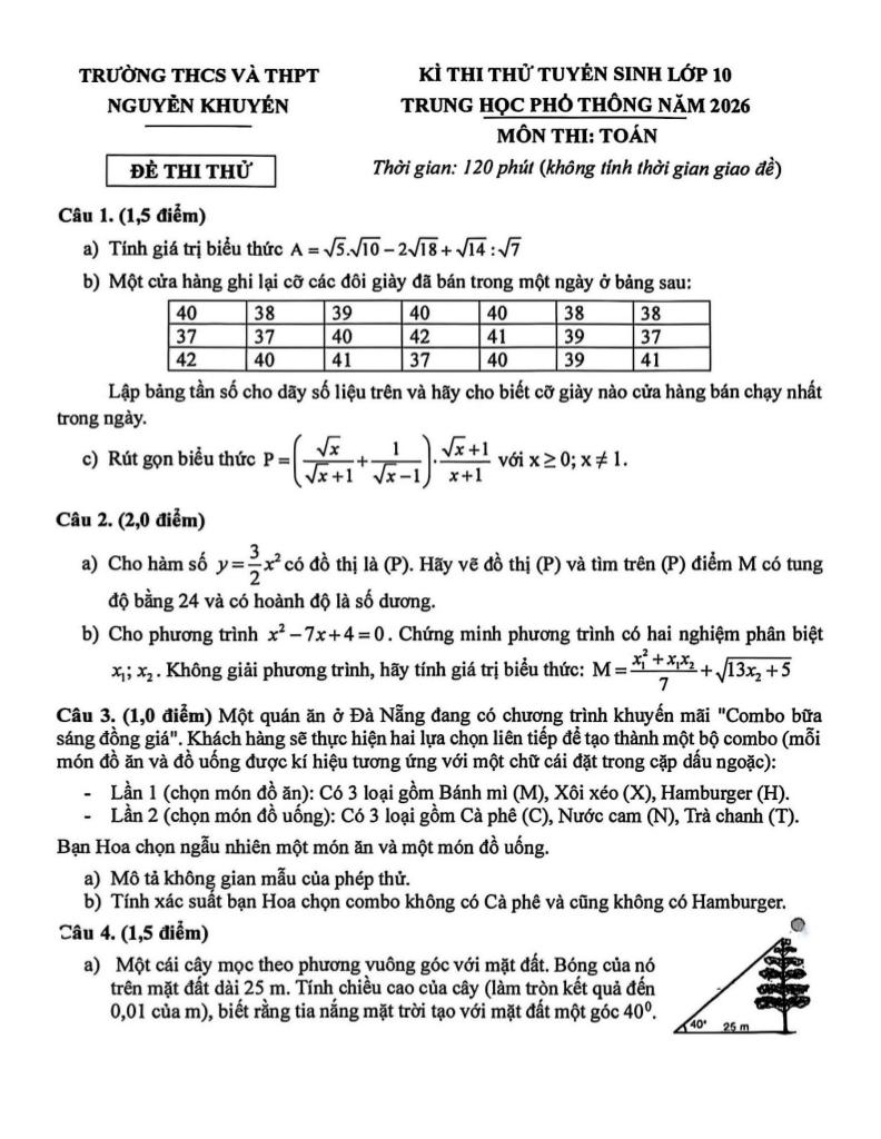 Trích dẫn Đề thi thử tuyển sinh lớp 10 môn Toán năm 2026 trường Nguyễn Khuyến – Đà Nẵng: