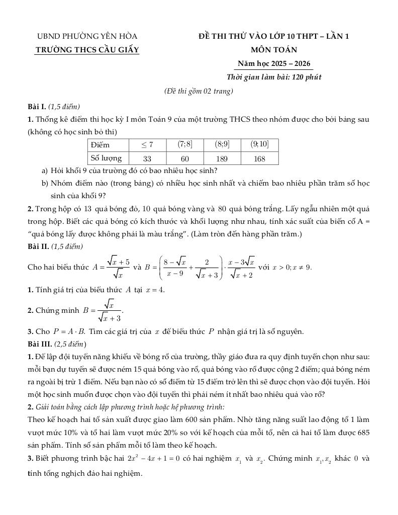 Trích dẫn Đề thi thử vào lớp 10 môn Toán lần 1 năm 2026 trường THCS Cầu Giấy – Hà Nội: