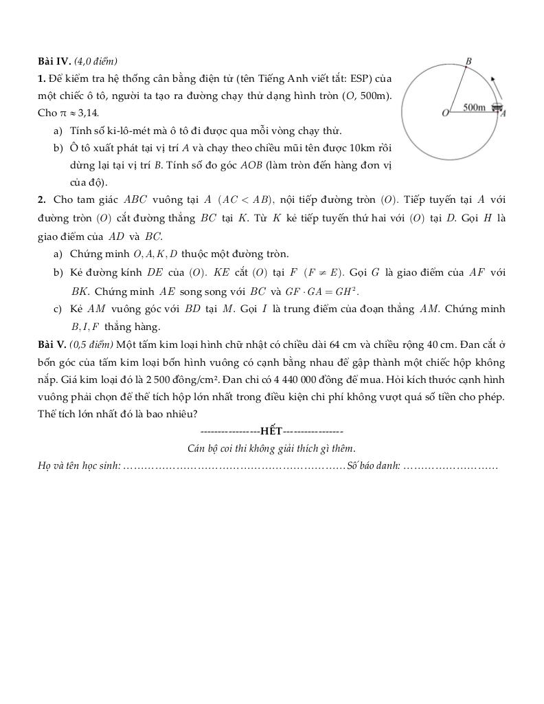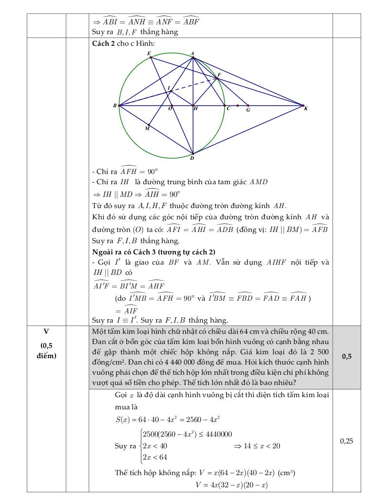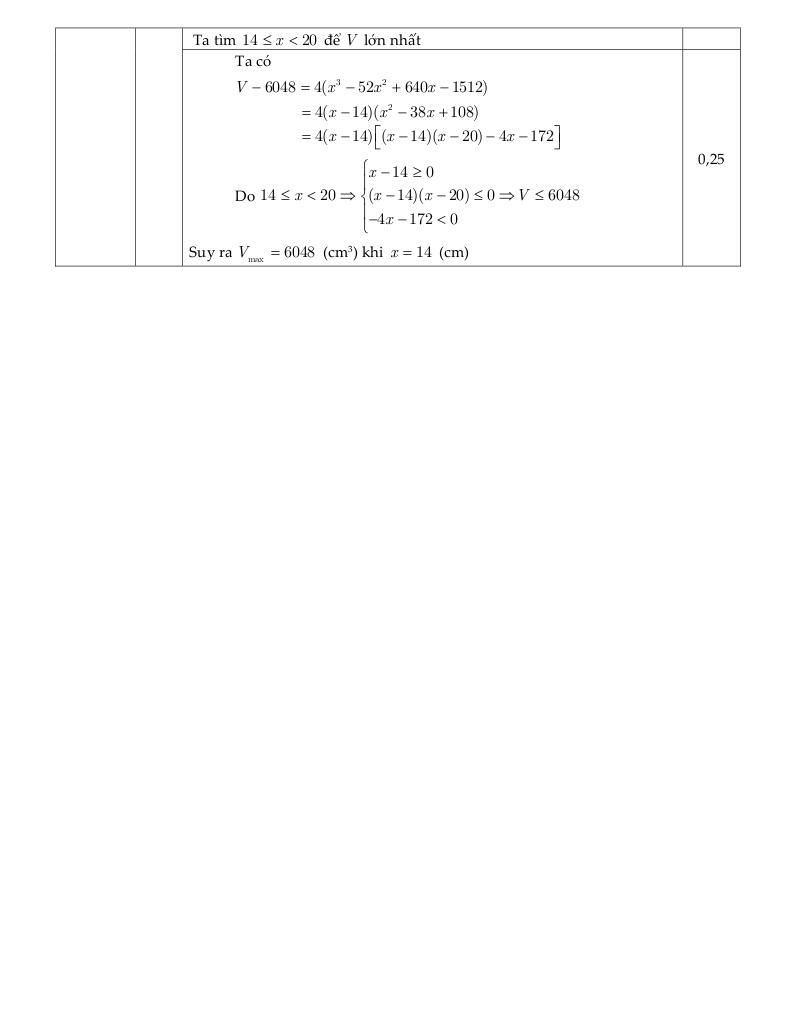 + Một tấm kim loại hình chữ nhật có chiều dài 64 cm và chiều rộng 40 cm. Đan cắt ở bốn góc của tấm kim loại bốn hình vuông có cạnh bằng nhau để gập thành một chiếc hộp không nắp. Giá kim loại đó là 2 500 đồng/cm². Đan chỉ có 4 440 000 đồng để mua. Hỏi kích thước cạnh hình vuông phải chọn để thể tích hộp lớn nhất trong điều kiện chi phí không vượt quá số tiền cho phép. Thể tích lớn nhất đó là bao nhiêu?