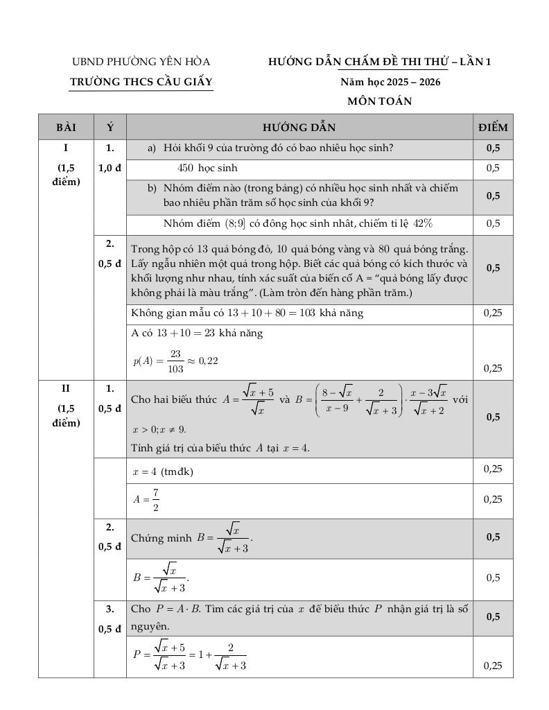 Giải Toán đề thi thử vào lớp 10 môn toán lần 1 năm 2026 trường thcs cầu giấy – hà nội với Đáp Án Mới Nhất