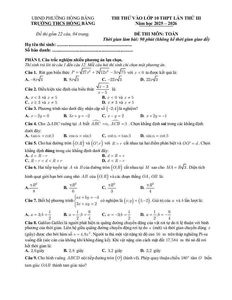 Trích dẫn Đề thi thử vào lớp 10 môn Toán lần 3 năm 2026 trường THCS Hồng Bàng – Hải Phòng: