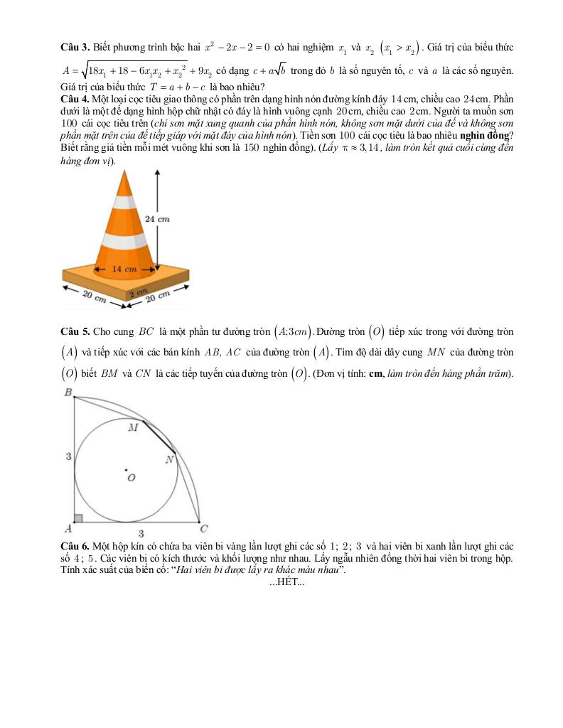 + Một loại cọc tiêu giao thông có phần trên dạng hình nón đường kính đáy 14 cm, chiều cao 24 cm. Phần dưới là một đế dạng hình hộp chữ nhật có đáy là hình vuông cạnh 20 cm, chiều cao 2 cm. Người ta muốn sơn 100 cái cọc tiêu trên (chỉ sơn mặt xung quanh của phần hình nón, không sơn mặt dưới của đế và không sơn phần mặt trên của đế tiếp giáp với mặt đáy của hình nón). Tiền sơn 100 cái cọc tiêu là bao nhiêu nghìn đồng? Biết rằng giá tiền mỗi mét vuông khi sơn là 150 nghìn đồng). (Lấy π = 3,14, làm tròn kết quả cuối cùng đến hàng đơn vị).