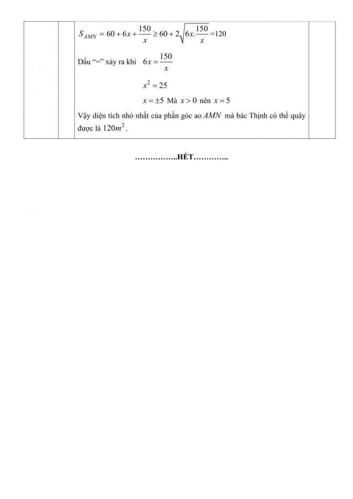 + Nhà bác Thịnh có một cái ao nuôi cá hình chữ nhật ABCD (như hình minh họa bên cạnh). Đợt này vừa có một loại cá giống mới nên bác đã giăng lưới quây lại để nuôi thử nghiệm trên một góc ao của mình. Biết rằng lưới được giăng theo một đường thẳng từ một vị trí M ở bờ AB đến một vị trí N ở bờ AD và phải đi qua một cái cọc cố định đã cắm sẵn ở vị trí E. Biết khoảng cách EH và EQ từ cọc E đến bờ AB, AD lần lượt là 5m và 12m. Hỏi diện tích nhỏ nhất của phần góc ao AMN mà bác Thịnh có thể quây được là bao nhiêu?