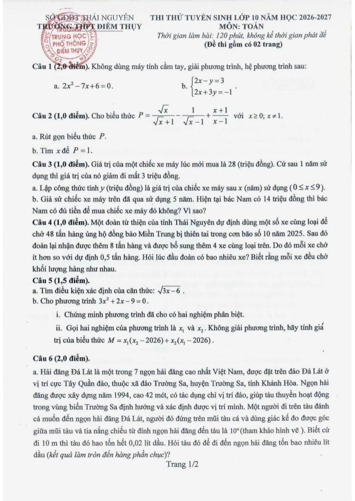 Trích dẫn Đề thi thử vào lớp 10 môn Toán năm 2026 – 2027 trường THPT Điềm Thụy – Thái Nguyên: