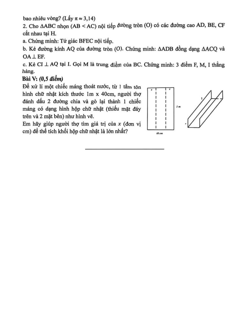 + Để xử lí một chiếc máng thoát nước, từ 1 tấm tôn hình chữ nhật kích thước 1m x 40cm, người thợ đánh dấu 2 đường chia và gò lại thành 1 chiếc máng có dạng hình hộp chữ nhật (thiếu mặt đáy trên và 2 mặt bên) như hình vẽ. Em hãy giúp người thợ tìm giá trị của x (đơn vị cm) để thể tích khối hộp chữ nhật là lớn nhất?