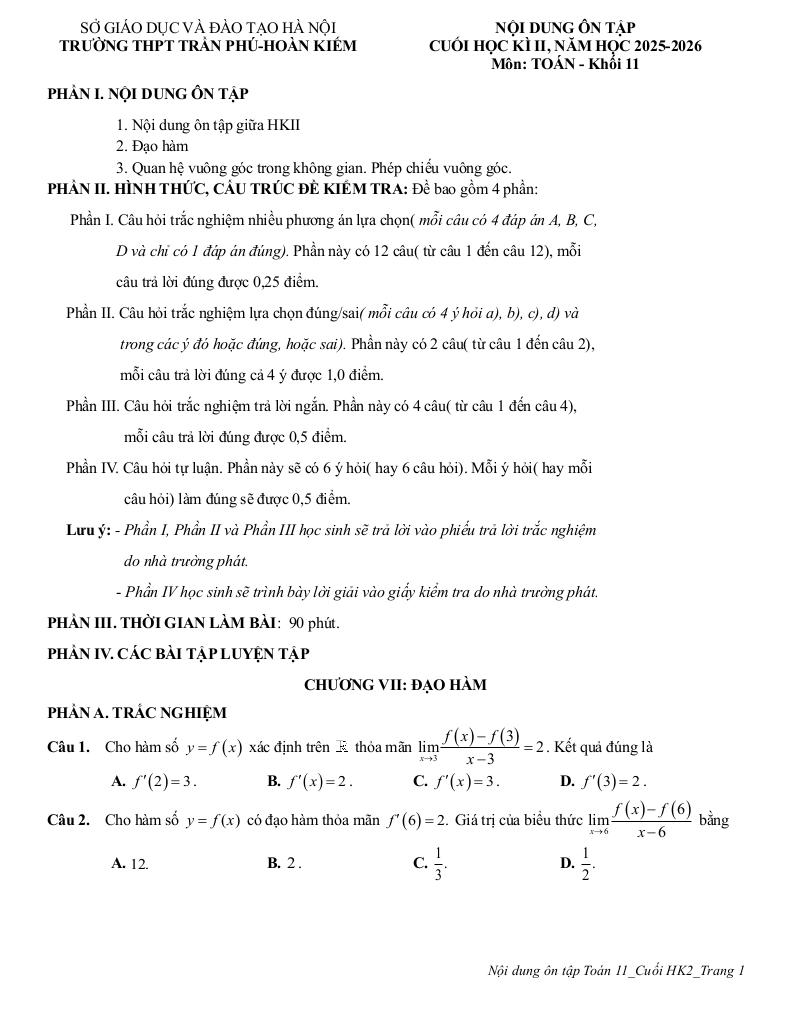 giaitoan.edu.vn giới thiệu đến quý thầy, cô giáo và các em học sinh đề cương hướng dẫn nội dung ôn tập cuối học kì 2 môn Toán 11 năm học 2025 – 2026 trường THPT Trần Phú – Hoàn Kiếm, thành phố Hà Nội.