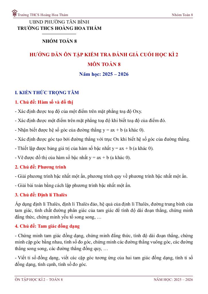 giaitoan.edu.vn giới thiệu đến quý thầy, cô giáo và các em học sinh đề cương hướng dẫn ôn tập kiểm tra cuối học kì 2 môn Toán 8 năm học 2025 – 2026 trường THCS Hoàng Hoa Thám, phường Tân Bình, thành phố Hồ Chí Minh.