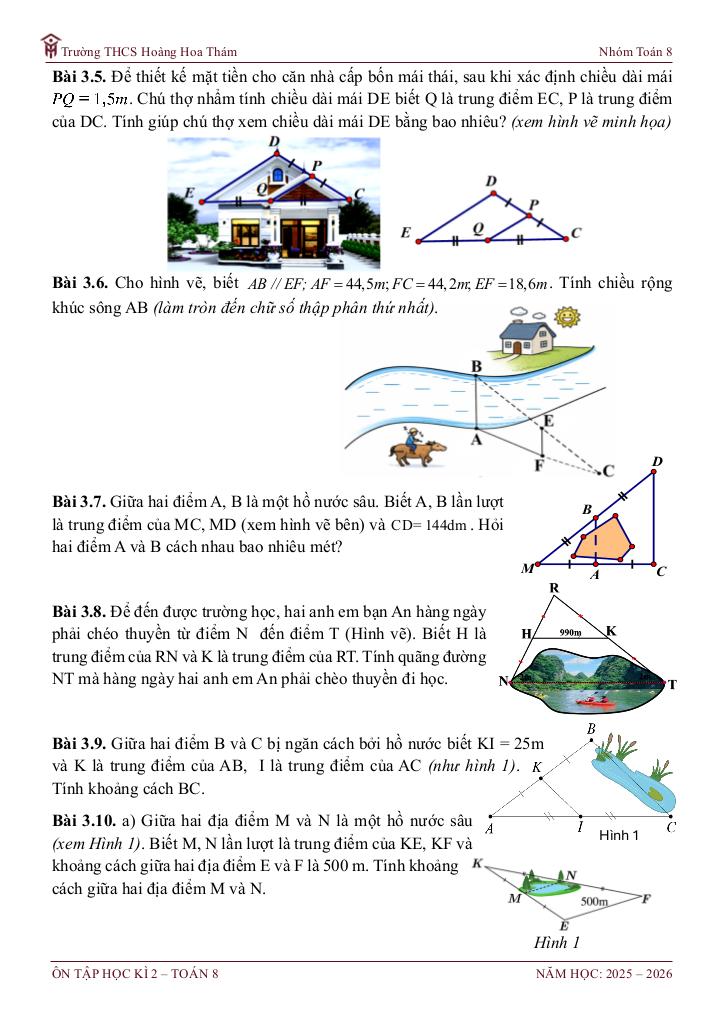 – Áp dụng định lí Thalès, định lí Thalès đảo, hệ quả của định lí Thalès, đường trung bình của tam giác, tính chất đường phân giác của tam giác để tính độ dài đoạn thẳng, chứng minh đẳng thức, chứng minh yếu tố song song.