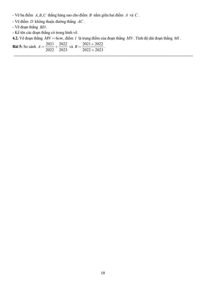– Nhận biết được khái niệm ba điểm thẳng hàng, điểm nằm giữa hai điểm. Tính độ dài đoạn thẳng.