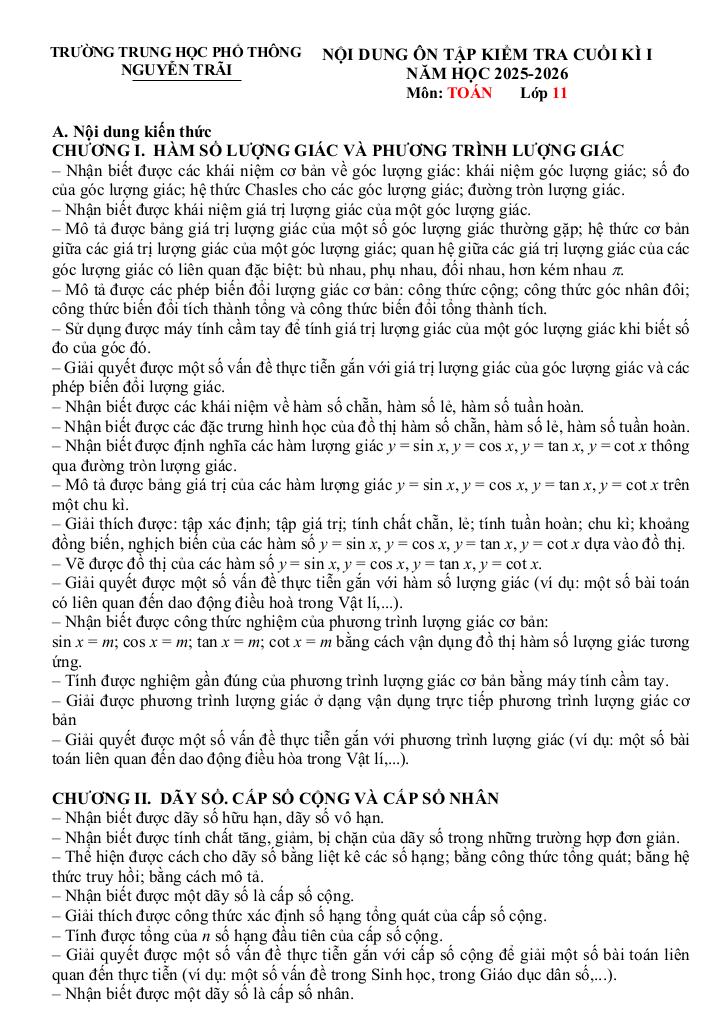 giaitoan.edu.vn giới thiệu đến quý thầy, cô giáo và các em học sinh đề cương hướng dẫn nội dung ôn tập kiểm tra cuối học kì 1 môn Toán 11 năm học 2025 – 2026 trường THPT Nguyễn Trãi, thành phố Đà Nẵng.