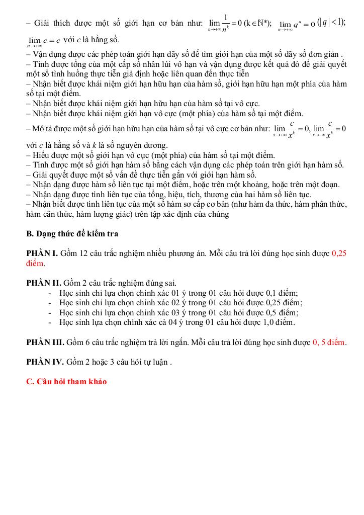 – Nhận biết được tính liên tục của một số hàm sơ cấp cơ bản (như hàm đa thức, hàm phân thức, hàm căn thức, hàm lượng giác) trên tập xác định của chúng.