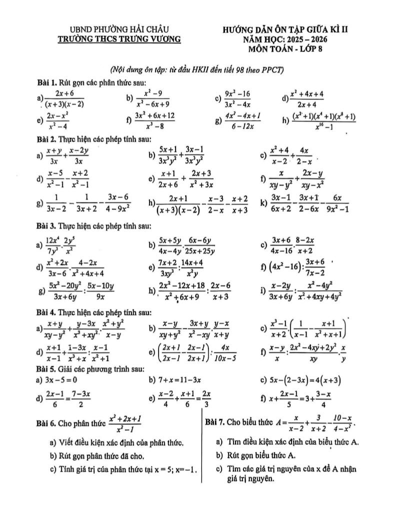Toán học luôn là một môn học quan trọng, giúp học sinh phát triển tư duy logic và kỹ năng giải quyết vấn đề. Để hỗ trợ các bạn học sinh và giáo viên trong việc học tập và giảng dạy, bài viết này sẽ cung cấp lời giải chi tiết và đáp án chính xác cho chủ đề ôn tập giữa kì 2 toán 8 năm 2025 – 2026 trường thcs trưng vương – đà nẵng, giúp bạn hiểu sâu và tự tin hơn khi làm bài tập.