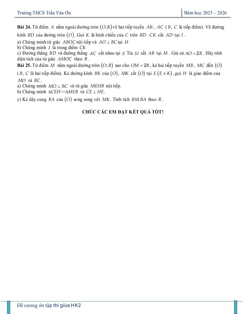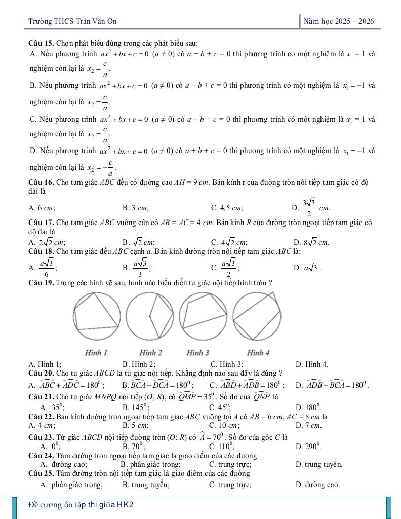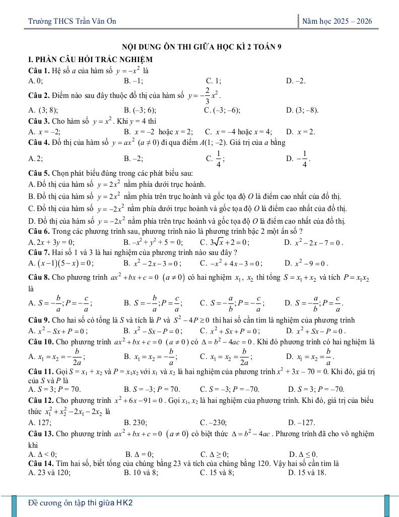 ôn tập giữa kì 2 toán 9 năm 2025 – 2026 trường thcs trần văn ơn – tp hcm đặc sắc thuộc chuyên mục