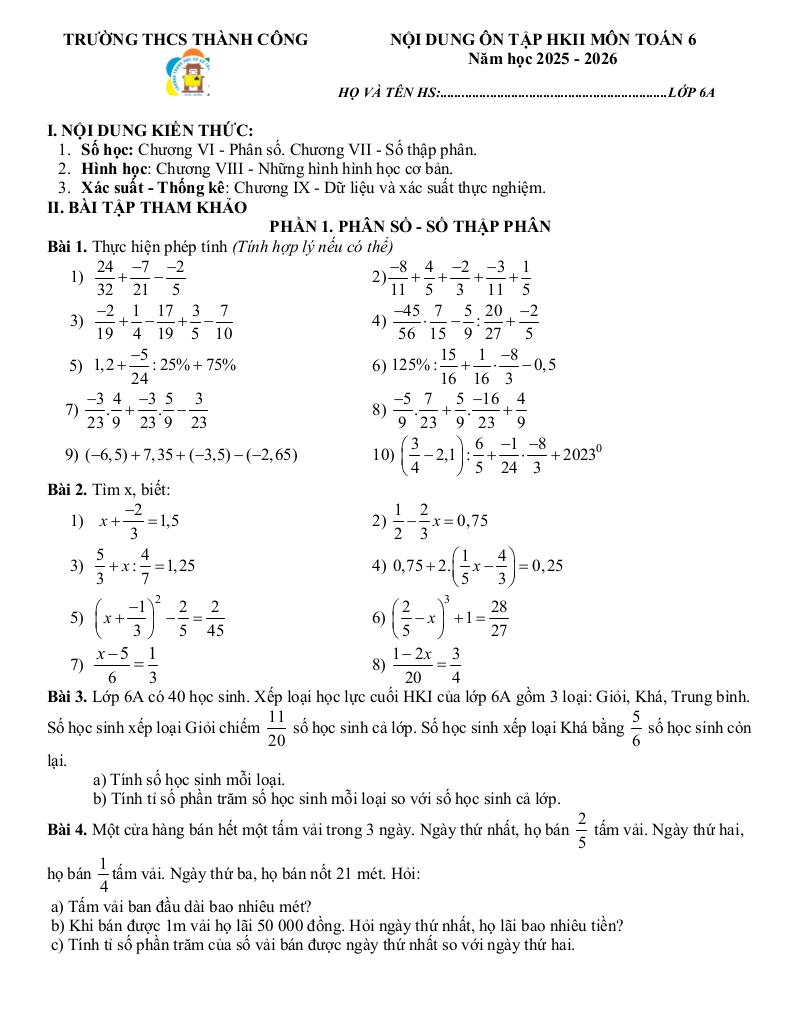 ôn tập học kỳ 2 toán 6 năm 2025 – 2026 trường thcs thành công – hà nội là một trong những phần kiến thức quan trọng trong chương trình toán học, thường xuất hiện trong các bài kiểm tra và kỳ thi lớn. Việc nắm vững phần này không chỉ giúp bạn đạt điểm cao mà còn tạo nền tảng vững chắc để học các nội dung nâng cao hơn.