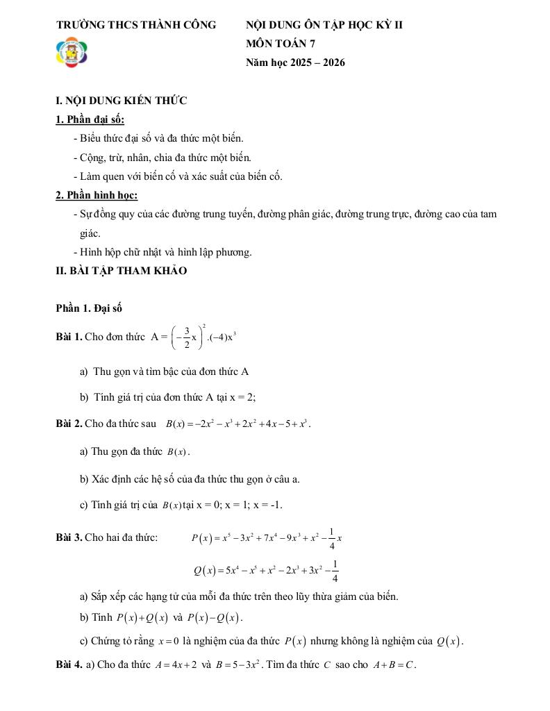 ôn tập học kỳ 2 toán 7 năm 2025 – 2026 trường thcs thành công – hà nội là một trong những phần kiến thức quan trọng trong chương trình toán học, thường xuất hiện trong các bài kiểm tra và kỳ thi lớn. Việc nắm vững phần này không chỉ giúp bạn đạt điểm cao mà còn tạo nền tảng vững chắc để học các nội dung nâng cao hơn.