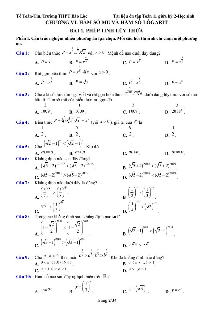 CHƯƠNG VI. HÀM SỐ MŨ VÀ HÀM SỐ LÔGARIT 2.