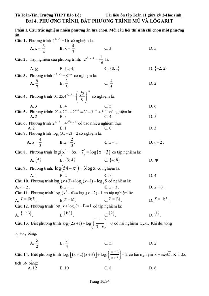 Bài 4. Phương trình, bất phương trình mũ và lôgarit 10.