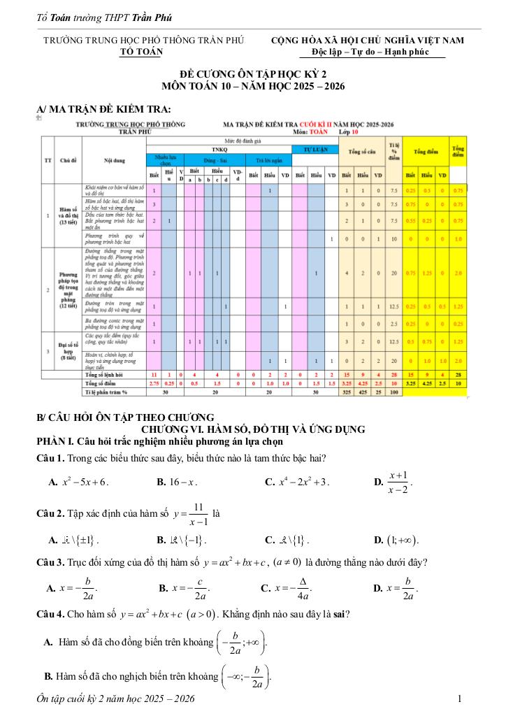 giaitoan.edu.vn giới thiệu đến quý thầy, cô giáo và các em học sinh tài liệu ôn tập cuối học kỳ 2 môn Toán 10 năm học 2025 – 2026 trường THPT Trần Phú, thành phố Đà Nẵng.